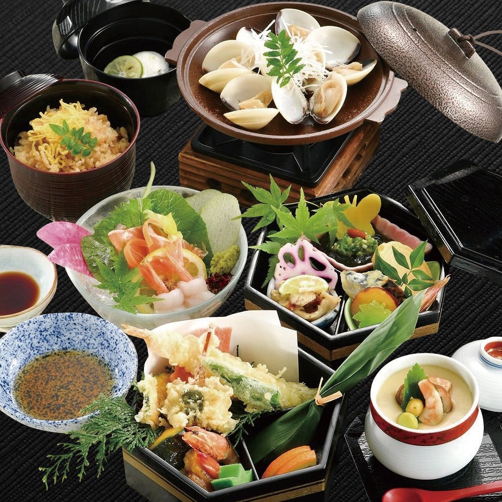 季節の焼八寸、汁物、お造り盛り合わせ、焚き合わせ、陶板焼き(蛤の酒蒸し)、天麩羅盛り合わせ、茶碗蒸、酢の物、季節の御飯、季節の水菓子
