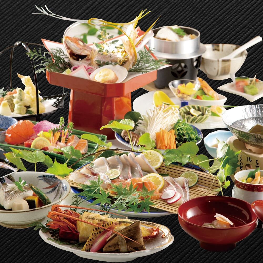 季節の焼八寸、汁物、お造り盛り合わせ、焼鯛、海鮮しゃぶしゃぶ、蒸し物、天麩羅盛り合わせ、強肴、茶碗蒸、鯛釜めし、季節の水菓子